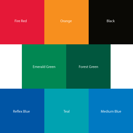 These color swatches will give you a good idea of what our standard colors will look like when printed (colors viewed on computer monitor are not 100% accurate).