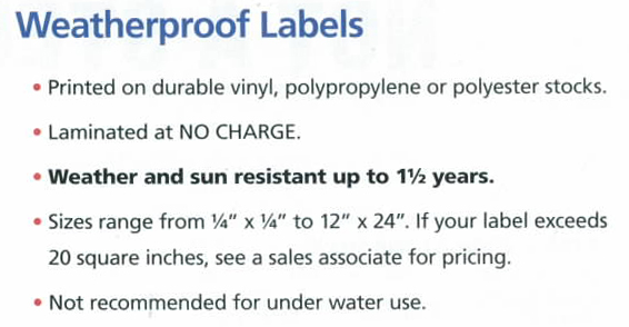 A. Labels are typically printed on thin paper or vinyl, and they are printed via flexography. They are inexpensive for sure, but not the right product for outdoor or underwater application. "Weatherproof" labels require a laminate, otherwise the ink will literally wash away. There is an excellent chance the laminate will begin to separate from the base of the decal, taking the ink with it. Decals on the other hand, are printed either via screen print or digital print, on a